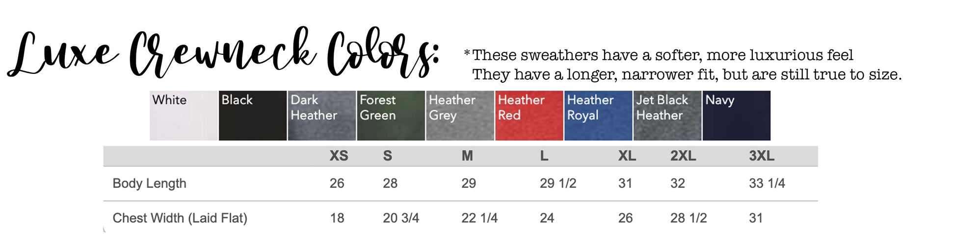 *NOTE: Luxe Crewnecks fit longer and narrower in the body than our “Classic Fit”. Please consult size charts + contact us with any questions.